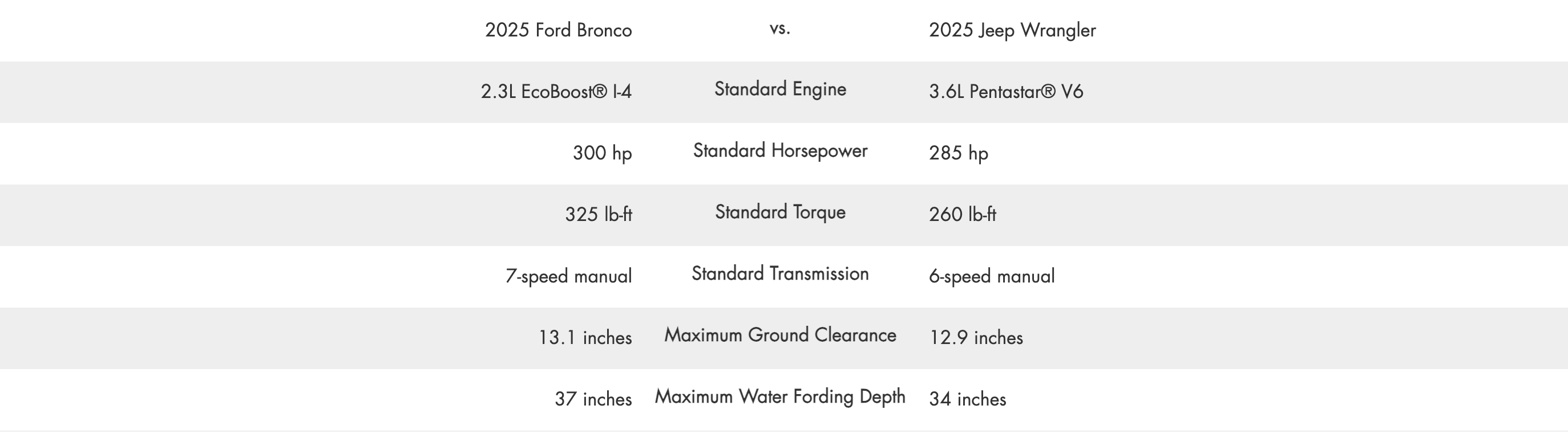2025 Ford Bronco vs. Jeep Wrangler Specs: Standard Performance