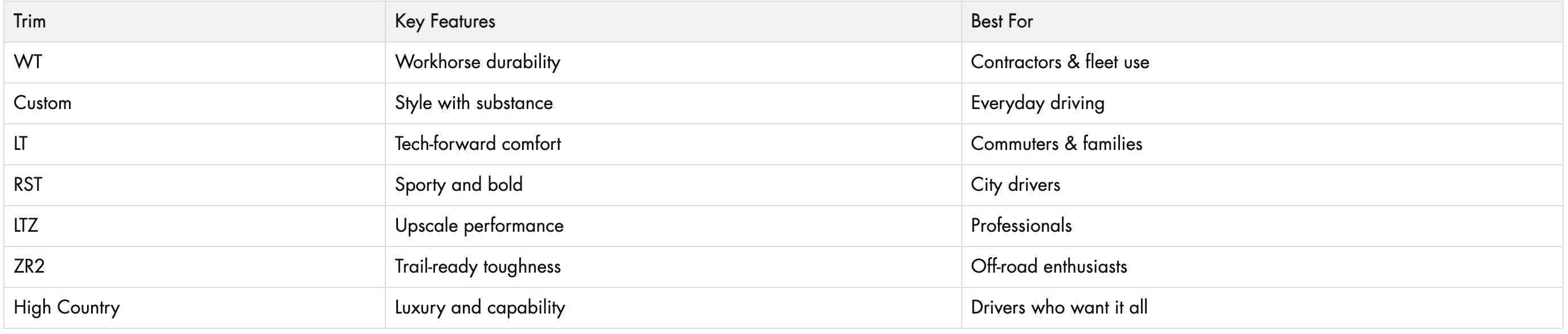 If you’re looking to compare Silverado trims, here’s a quick overview to help narrow your choices: