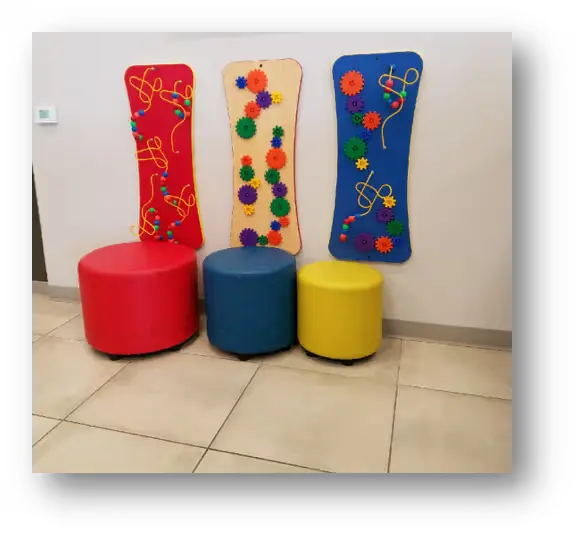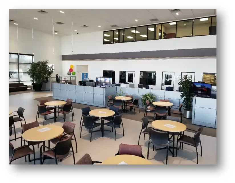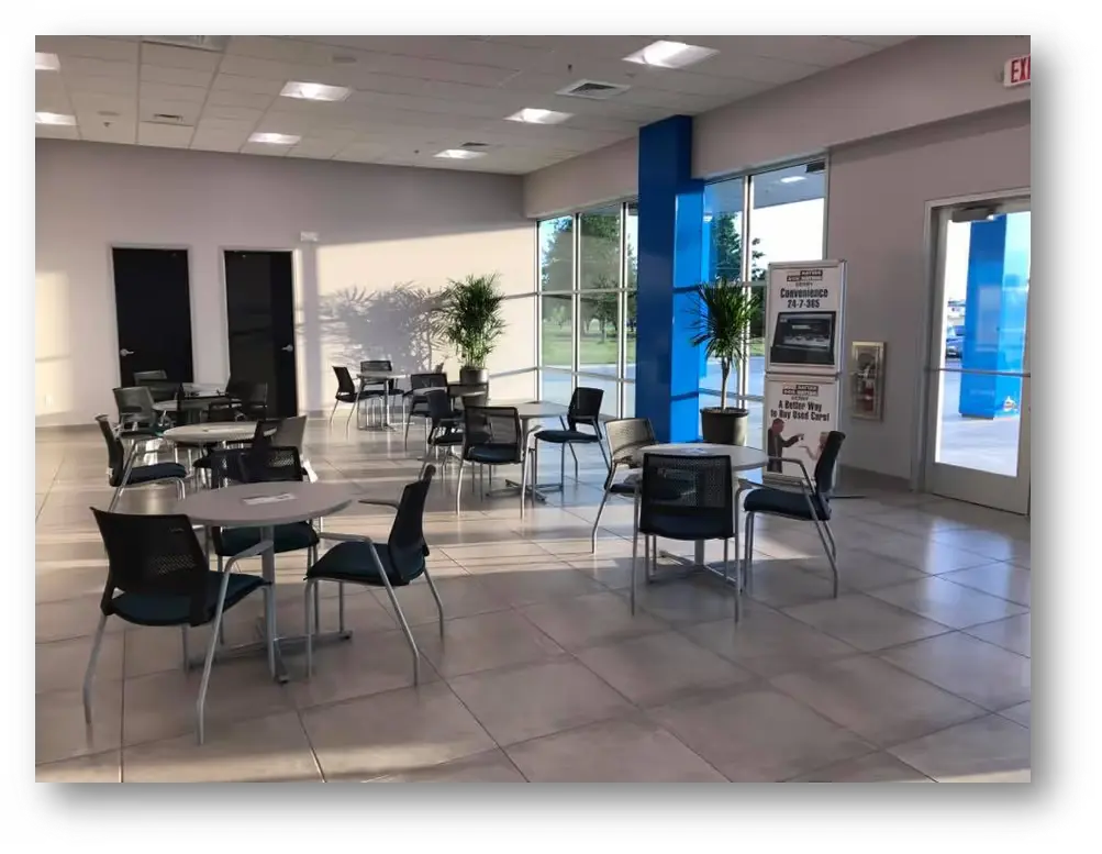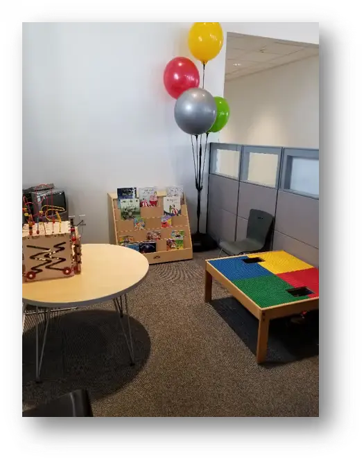 Comfortable waiting room with complimentary snacks and drinks, massage chairs, kids area & wi-fi